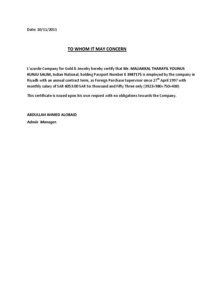 Salary Certificate Format In Saudi Arabia